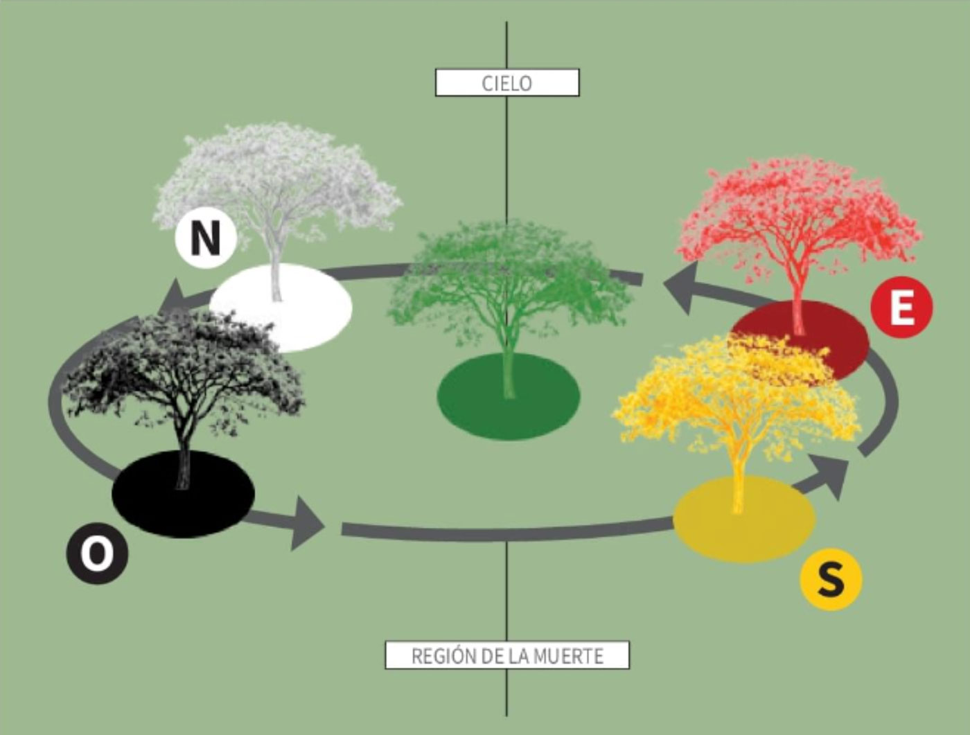 A su vez, este eje atraviesa un plan horizontal regido por los cuatro puntos cardinales. A cada cuadrante corresponde un color y una esencia de árbol sagrado diferente, el cual clava sus raíces en los inframundos y eleva sus ramas para sostener la bóveda celeste, aunque cabe mencionar que no había consenso en Mesoamérica acerca de los colores y los árboles presentes en cada cuadrante. También se consideraba el centro como el punto por el cual pasaba el eje central o axis mundi, que permitía conectar los tres grandes niveles. Así mismo, este plan se representaba como un quincunce, un elemento presente en toda la iconografía mesoamericana.